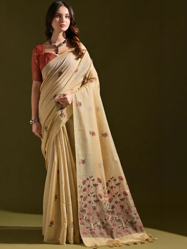 Beige Pure Cotton Saree For Women