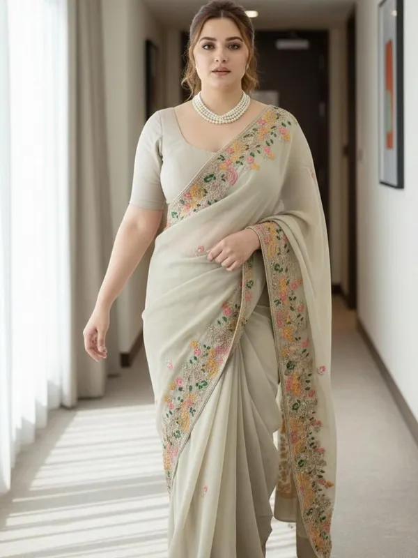 Beige Silk Blend Saree For Women