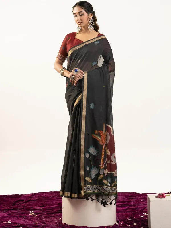 Black Pure Cotton Saree For Women