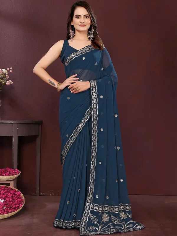 Blue Poly Georgette Saree For Women