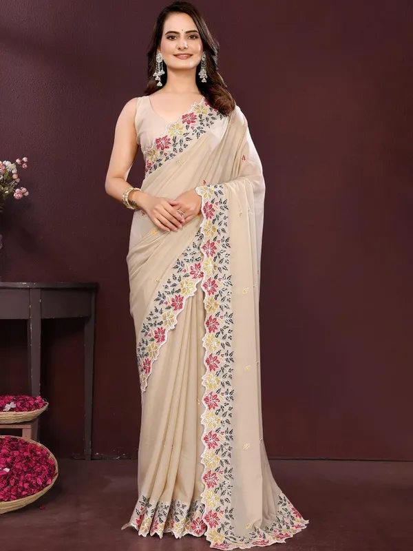 Cream Poly Georgette Saree For Women
