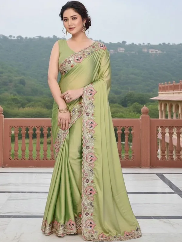Lime Green Silk Blend Saree For Women