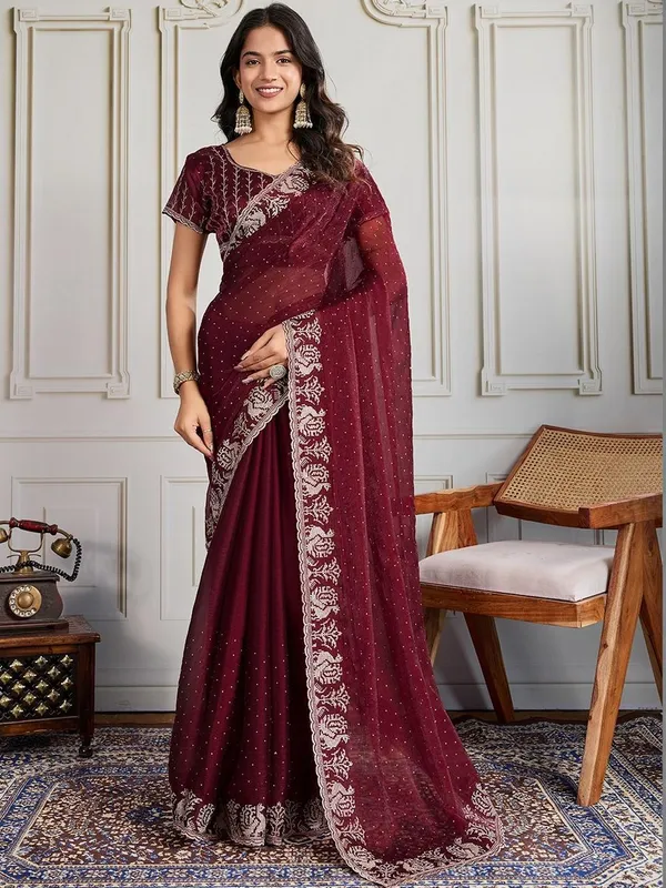Maroon Pure Chiffon Saree For Women