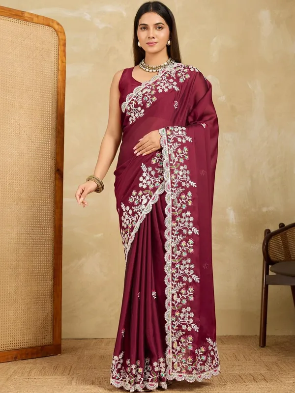 Maroon Silk Blend Saree For Women