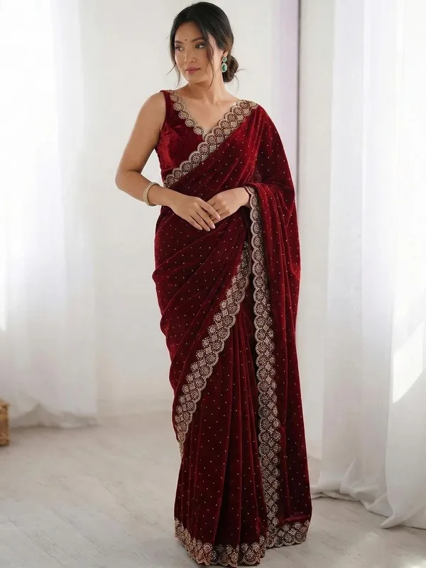 Maroon Velvet Saree For Women