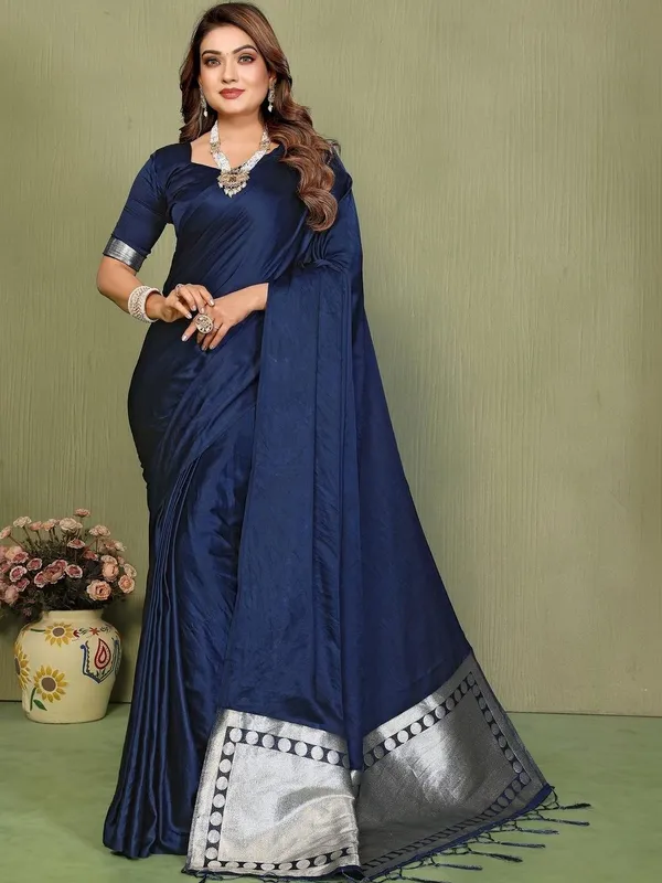 Navy Blue Satin Saree For Women
