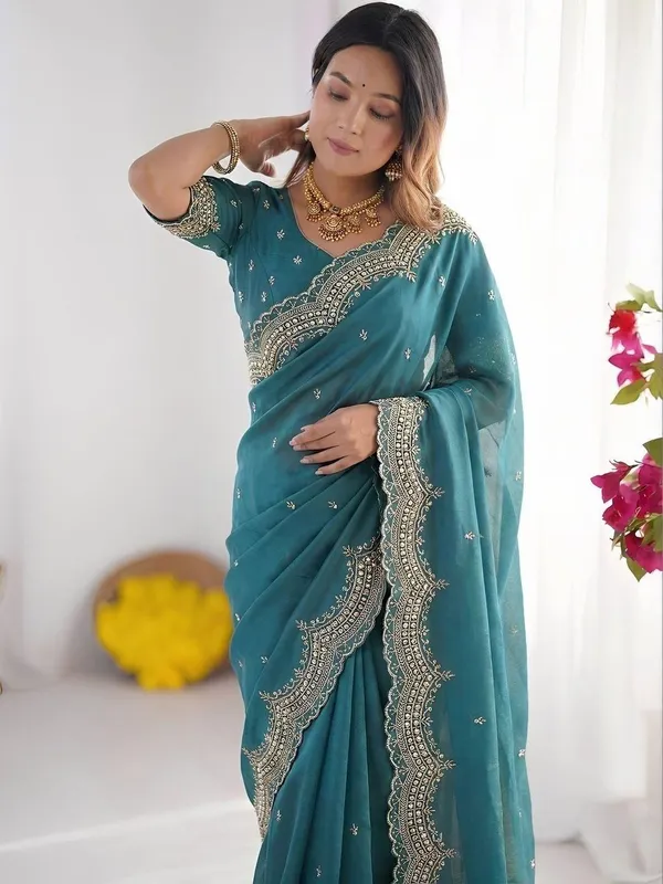 Ocean Blue Poly Georgette Saree For Women