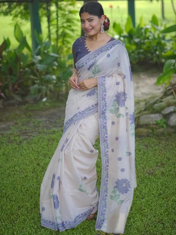 Off White Pure Cotton Saree For Women