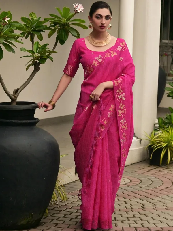 Pink Jute Silk Saree For Women