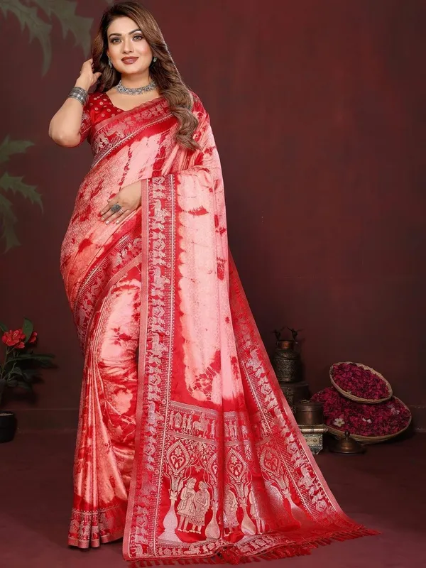 Red And Pink Satin Saree For Women