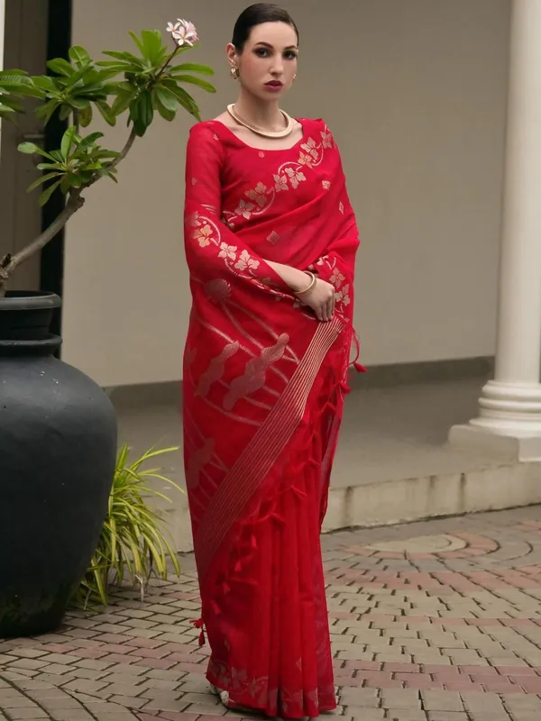 Red Jute Silk Saree For Women