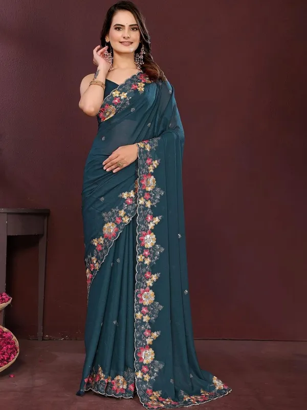 Teal Poly Georgette Saree For Women