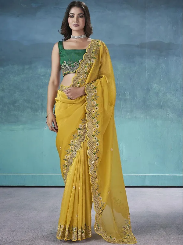 Yellow Silk Blend Saree For Women